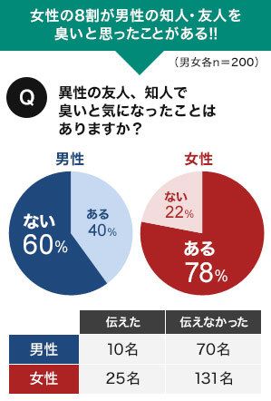 見れば分かる顔のテカリと違って、ニオイにおいては極めて自覚しづらい。しかも、他人にあまり指摘されない(男性の友人・知人をクサいと気になったことがある女性は200人中156人。それを伝えた人は25名、伝えなかった人は131名!)。