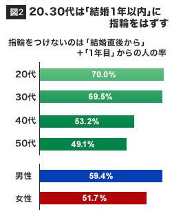 さらに、指輪をつけなくなった時期は「(結婚)直後から」と「1年目」を合わせて男性が約60%、女性が約50%。20、30代が1年以内に「つけなくなった」率は実に70%だ。迷いに迷って選んだ指輪をつけずにいるのは一体どういうわけなのか?