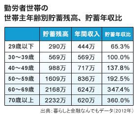 次に紹介するのは、金融広報中央委員会の「暮らしと金融なんでもデータ」に出ている、勤労者世帯の世帯主年齢別貯蓄残高、貯蓄年収比(2012年)です(https://www.shiruporuto.jp/finance/tokei/stat/stat002.html・表参照)。