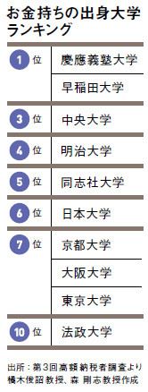 東京大学の卒業生が学業に秀でているのは自明だが、社会へ出た後に「富裕層」に括られるほどに蓄財できるものなのか――。長年にわたってお金持ちの研究を続けてきた京都女子大学の橘木俊詔客員教授の高額納税者のデータを基にした調査(表参照)によると、医師以外の職業における高額納税者は、慶應義塾大、早稲田大をはじめとする有名私学が6位までを占めている。東大は、京都大、大阪大といった旧帝国大学2校とともに、かろうじて7位にランクインしているにすぎない。