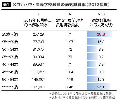 表1は、2012年度の公立小・中・高校教員の病気離職率を年齢層別に計算したものです。分母ですが、当該年の本務教員数を年齢層別に知ることはできませんので、翌年の数値で代替しています。