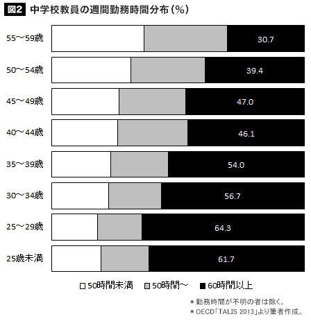 その一方で、上の世代は若手に各種の雑務を押し付けてくる。2013年の国際教員調査(TALIS 2013)で、日本の中学校教員は世界一働いていることが分かったのですが、年齢層別にみると勤務時間が長いのは若年層です(図2)。