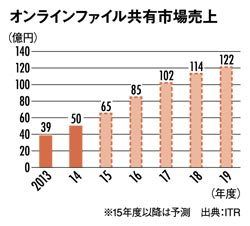 調査会社のアイ・ティ・アールの発表によると、2014年度の企業向けのオンラインファイル共有市場は前年度比28.2%増の50億円。今後も市場は19年度まで年平均21.3%で成長し、122億円に達する見込み。