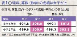 表1:理科、算数(数学)の成績は女子が上