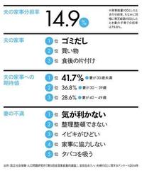 しかし、収入と同様、家事の分担も男女平等化しているかといわれれば、いまだ耳が痛い読者も多いだろう。夫の家事分担率はわずか14.9%。家事仕事が20あった場合、なんと3つしか担当していない計算になる。(表を参照)