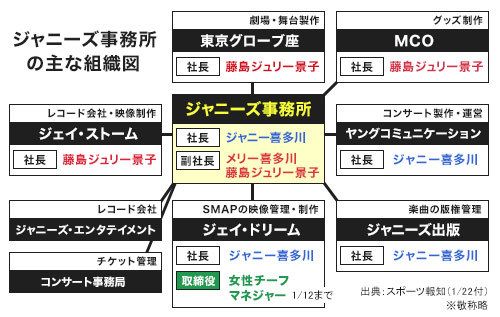 ジャニーズ事務所は社長のジャニー喜多川氏と姉のメリー喜多川副社長、メリー氏の娘の藤島ジュリー景子氏が副社長を務める同族企業であると同時に、グループの売上げが1000億円と推計される大企業である。