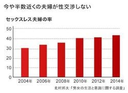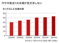 今や既婚者の2組に1組がセックスレス。家族計画研究センターが2014年に行った調査によると、夫婦のセックスレス率は44.6%だ。