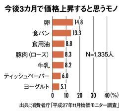 消費者庁が発表した2015年11月の物価モニター調査結果(速報)、価格の上昇幅が前月比1%以上の品目は、前月比1.5%増の冷凍コロッケと、同1.1%増の卵だった。物価モニター調査で対象となっているのは25品目で、食品では食パン、生中華麺、カップ麺、ソーセージ、豚肉(ロース)、豆腐、牛乳、ヨーグルト、卵、茶飲料、果実飲料、ポテトチップスなどがある。