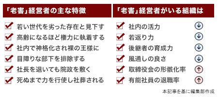 たとえば2012年2月に菊川剛前社長ら旧経営陣3人を含む7人が逮捕されたオリンパスの損失隠しによる粉飾決算事件も老害が生んだ悲劇だった(逮捕時菊川氏は71歳)。