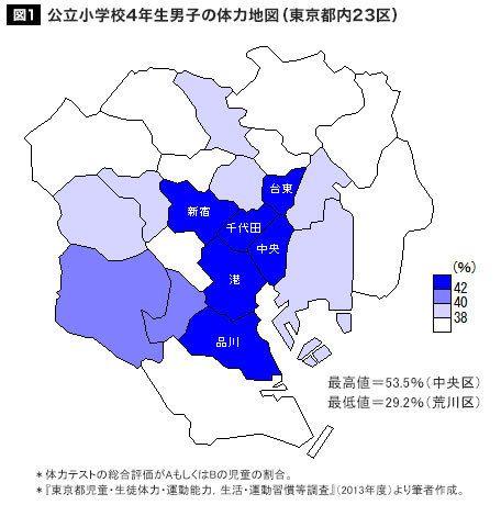 都心では、体育の授業を屋上でやっている学校も少なくないと聞きますが、ちょっと意外です。私は、公園などの遊び場が多い周辺の区で、子どもの体力は高いと思っていましたが、そういう条件とは関連していません。