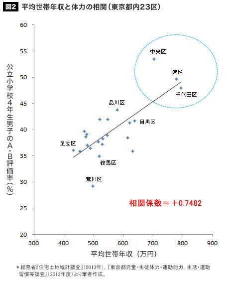 濃い色のゾーンには、タワーマンションが林立する中央区、六本木ヒルズの港区など、富裕層が多い区が含まれています。横軸に平均世帯年収、縦軸に小4男子の体力成績をとった座標上に、都内23区を配置すると、図2のようになります。各区の平均世帯年収は、2013年の総務省『住宅土地統計調査』のデータから計算しました。