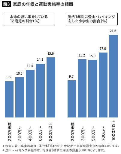 データでみても、スポーツの習い事や運動の実施率は、家庭の年収と相関しています。図3は、そのグラフです。登山・ハイキングは、学校の遠足などによるものは除きます。