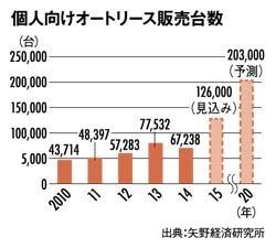 個人向けオートリース市場が拡大している。矢野経済研究所の発表によると2014年の個人向けオートリース販売台数は6万7238台で、15年は一気に10万台を突破して12万6000台まで増える見込みだ。(雑誌掲載当時)