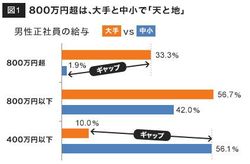 つまり、中小では800万円超になるのは1%しかいないのだ。大手が30%以上であることを考えると、その違いは小学生でもわかるほどに歴然としている。そして、400万円以下は、大手が10%に対して、中小は56.1%に達し、過半数を超えた。