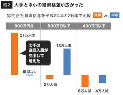 中小は低い年収の層が減り、高い年収にシフトした。しかし、それより目立つのが大手「800万円超」層の増加数だろう。出典:国税庁「民間給与実態調査」(平成24年版と最新版の平成26年版)