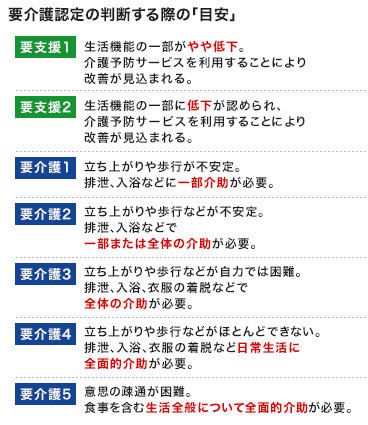 要介護1=立ち上がりや歩行が不安定。排せつや入浴に一部介助が必要となることが多い。