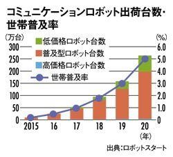 音声認識機能を持ち、会話によって人とコミュニケーションを取ることができるロボットを「コミュニケーションロボット」と呼ぶ。ロボットスタートとロボットドットインフォの調べによると、コミュニケーションロボットの2015年の出荷台数は約10万6000台程度。それが、5年後の20年には約265万台にまで増加するという。市場規模は2406億円、世帯普及率は5%になると予測している。