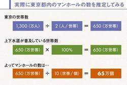 今回の問題では、(1)仮説として、マンホールの数は上下水道が普及している世帯数に比例すると考える。(2)問題を分解し、「東京の人口」(データ)、「1世帯当たりの人数」(推定量)、「上下水道の普及率」(推定量)、「マンホール1つ当たりの世帯数」(推定量)とする。(3)既知のデータとして、東京の人口は約1300万人という数字を活用する。(4)各要素の推定では、1世帯当たりの人数は、都会は1人暮らしも多いので2人とする。上下水道の普及率は100%。マンホール1つ当たりの世帯数は難しいが、ざっくりと10世帯と考える。(5)以上を総合して、東京にあるマンホールの数を推定する。