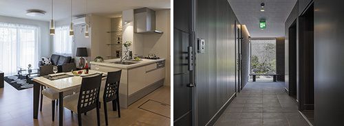 オートロックシステムに守られた玄関を入ると、上質な空間が広がる。自然石が配置された床に吹き抜けのあるエントランスホールなど、ステイタスを感じるホテルライクな空間づくりも自在だ。