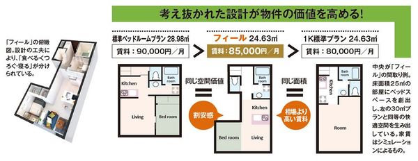 人口が集中する首都圏の限られた土地を高度活用する。その方針は部屋づくりにも生かされている。例えば主力商品の一つ「フィール」がそうだ。通常は1Kの広さである約25平方メートルの空間にリビングとベッドスペースを確保。一人暮らしをする人の多くが望む“寝食分離”に応えている。