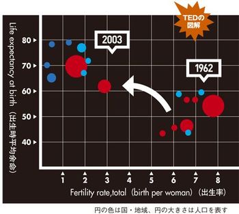 図は世界各国の出生率&余命年数の変遷を1960年代から2000年代まで見せ、人口を円の大きさで表したもの(実際は動画状態)。同じ国でも、時間の経過とともに人口が増減するプロセスが“風船”の大きさでよく理解できる。