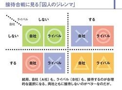 まず、A社の立場に立って考えてみよう。B社が接待しない場合、A社は接待したほうが得だ。受注の可能性が高まるからだ。一方、B社が接待する場合もA社は接待したほうがいい。そうでなければB社が受注する可能性が高くなるからだ。つまり、A社はいずれの場合も接待したほうが得なので、合理的に判断すると、接待すべきということになる。B社も同様に考え、接待するはずだ。したがって互いに合理的に判断すれば、両社ともに接待し、引き分けとなる。