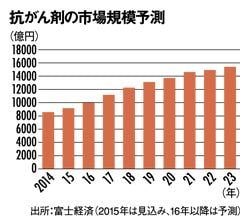 市場の拡大を支えるのは、「分子標的治療薬」という分野の製品だ。近年発売が相次いでおり、14年時点で市場の5割近くを占める。