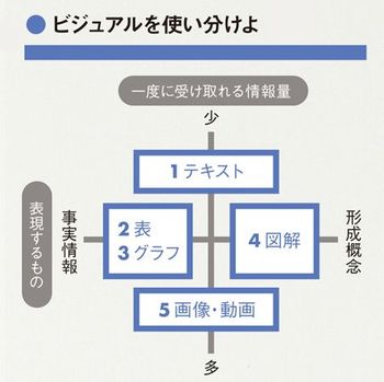 まず重要なのが、何をどのようなビジュアルで表現するのかという判断です(図を参照)。縦軸は、人が一度に受け取れる情報量の多寡。横軸は、表現するものが事実情報なのか、概念なのか。訴えたい内容によってビジュアル表現は変わります。