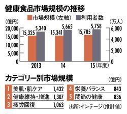 マーケティングリサーチ会社のインテージの調べによると、2015年の健康食品・サプリメント市場の推定市場規模は、1兆5785億円で対前年2.9%の増加だった。調査が始まった13年から市場の拡大傾向は続いている。分野別に見ると「美肌・肌ケア」が1432億円と最も割合が大きく、前年から165億円売り上げを伸ばしている。