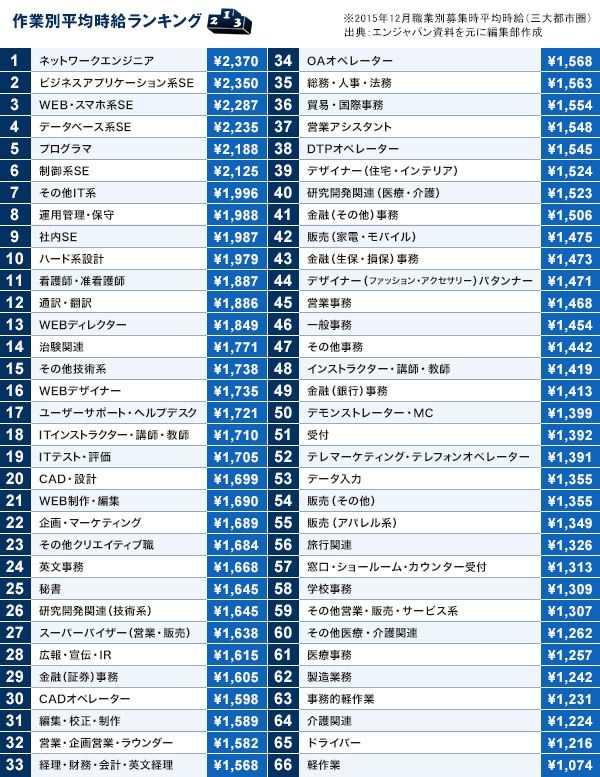 これまで営業系で多かった携帯や家電といった通信系が一定数をキープしつつも、アウトレットや大型ショッピングモールでの採用が増えているという。これはインバウンドに対応するニーズが増えたためだ。ITエンジニアはマイナンバーに対応するパッケージ開発や、クラウド化していくサービスに合わせたサーバー運用など、新しい案件が増え続けている。日進月歩で必要となる開発言語がどんどん変わっていることも要因のひとつ。まさに「仕事ならいくらでもあるのに人がいない!」という状態が、過去最高時給を記録した理由といえる。