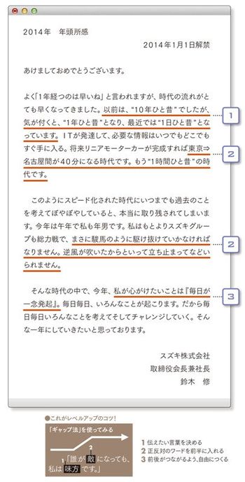 毎年年末になると広報からメディア宛てに送られてくる鈴木修会長兼社長の年頭所感。2013年は軽自動車税の増税が決まった年。過去のことにとらわれず、逆風にもめげずに前に進むという覚悟がひしひしと伝わってくる。