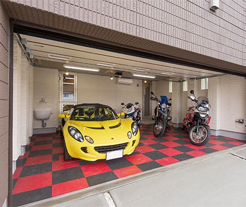 愛車とバイクを置くガレージ。大型のオーバースライディングシャッターは特注。