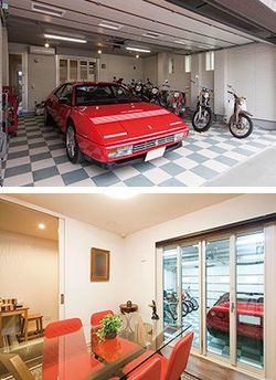 施主のS氏はここに、愛着あるフェラーリとロータス、ほかBMWをはじめとしたバイク数台を置いている。