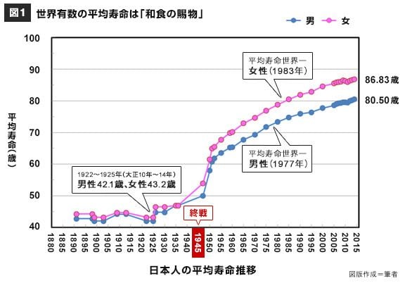 「一汁三菜の和食」が健康に役立つことは、日本人の寿命の変化を見れば、一目瞭然です(図1)。日本人の平均寿命は戦後、ほぼ一貫して延び続けており、現在は女性が86.83歳(世界1位)、男性80.50歳(世界3位)です(2015年、厚生労働省調査)。