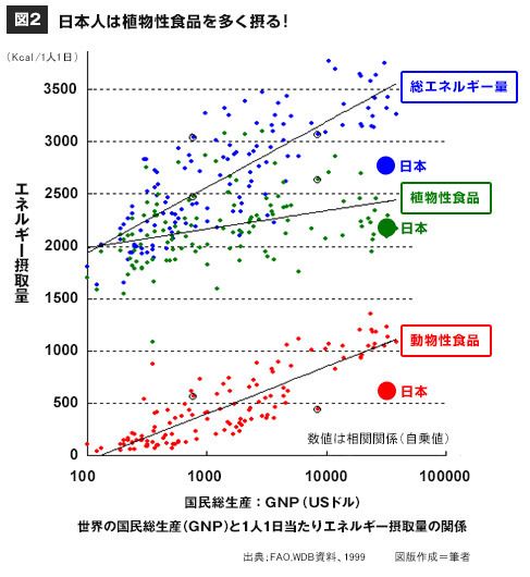 国が豊かになりGNP(国内総生産)が増えると、肉などの動物性食品の摂取量の増加とともにエネルギー摂取量も増加することが報告されています(図2)。