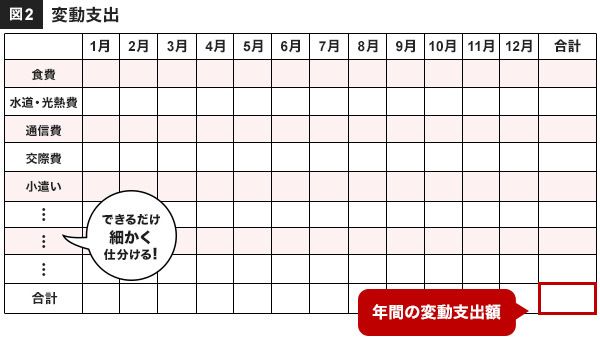 変動支出は、食費や水道・光熱費、通信費、交際費……などといった毎月金額が変わる支出のことです。ここで案外大事なのは、何に分類していいかわからずに「雑費・その他」欄を作ってしまうこと。これが落とし穴なのです。