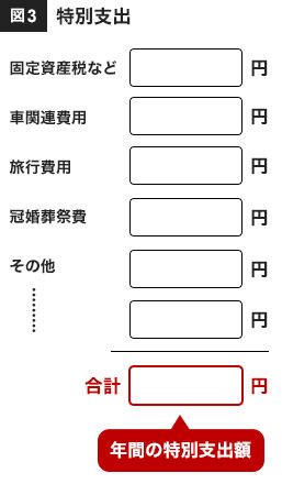 忘れがちなのが、年単位で払う車の税金や保険料、固定資産税などの「特別支出」です。冠婚葬祭、帰省や旅行などの旅費、スーツやコートなどの高額な被服費、電気製品の買い替えなども、これにあたります。