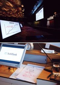 孫はプレゼンの冒頭で動画を効果的に活用している。例えば10年6月の「新30年ビジョン」の発表会では、孫がステージに現れる前、同ビジョンを策定していくプロセスがスクリーンに映し出された。