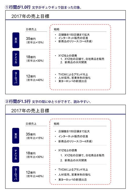 資料作成のルール 秘訣 #資料作成 #プレゼンテーション 2016/05/19 15:00 #1 #2 #3 #4 #5 見やすい資料は「余白」の使いかたが大切 PRESIDENT Online 熊野 整 +フォロー 前ページ 1 2 3 次ページ では、余白の広げ方を解説しましょう。 パワーポイントで文章を書く場合には、行間をしっかり広げておきたいところです。 例(1)は、パワーポイントのデフォルト設定でもある、行間が1.0行です。例(2)は、行間を1.5行に広げたものです。この2つを比べると、行間1.5行のほうが、文章が読みやすい印象になります。 次ページ 1 2 3 『外資系投資銀行の資料作成ルール66』(プレジデント社) STEPをなぞるだけ、見やすく、シンプル! 伝わるプレゼン術、「外資のスキル」を簡単マスター! 著者 熊野 整 AMAZONで購入する PRESIDENT Storeで購入する 関連記事 心理学が解明「一度見たら忘れられないレイアウト」のつくり方 目を釘付けにする企画書 捨てられる企画書 5分で完成!一発OK!「資料」のカンタン作り方 ランキング 1位 一家4人、6畳一間に暮らす苦境の中でも…ノーベル賞受賞者の山中伸弥さんに、病気の父は医学部進学を薦めた【2025年12月BEST】 ランキングをもっと見る キャリア #資料作成 #プレゼンテーション #パワーポイント #エクセル