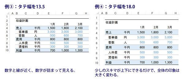 例(3)は、デフォルトのタテ幅13.5で、例(4)はタテ幅を18.0に広げたものです。こちらも、タテ幅を広げると、数字がすっきり見やすくなります。なお、文字フォントサイズは11です。