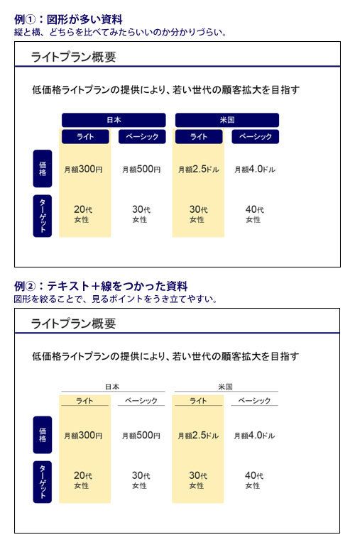資料作成のルール 秘訣 #資料作成 #プレゼンテーション 2016/05/26 13:00 #1 #2 #3 #4 #5 やめよう! 図形だらけのパワーポイント PRESIDENT Online 熊野 整 +フォロー 前ページ 1 2 3 次ページ パワーポイントの場合、丸や四角の図形を使いすぎると、それをきれいに並べるだけでも一苦労です。並びがすこしズレているだけでも気になってしまい、その修正だけで多くの時間を取られてしまうのは非効率です。できるだけ図形は使わずに、スッキリ見やすい資料作成を心がけたいものです。 たとえば例(1)のように、タテ・ヨコそれぞれに図形を使ってしまうと、ごちゃごちゃした印象です。例(2)のように、横の項目はテキスト+線だけにすると、すっきりした印象ですね。 次ページ 1 2 3 『外資系投資銀行の資料作成ルール66』(プレジデント社) STEPをなぞるだけ、見やすく、シンプル! 伝わるプレゼン術、「外資のスキル」を簡単マスター! 著者 熊野 整 AMAZONで購入する PRESIDENT Storeで購入する 関連記事 資料のメッセージを効果的に視覚化する「テキスト・表」の使い分け そのプレゼン資料、論理破綻していませんか?「ストーリーボード」で再チェック プレゼンのメッセージにインパクトを与える“6つの要件” ランキング 1位 「怖い」と言い残し妻は2歳息子と出て行った…家事も育児もする自称いい夫(36)が自分の暴力性に気づくまで ランキングをもっと見る キャリア #資料作成 #プレゼンテーション #エクセル #パワーポイント