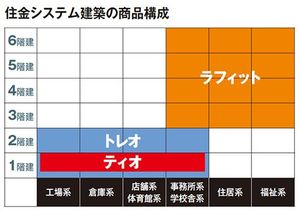 このシステム建築の分野において、多彩な商品群で受注を伸ばしているのが住金システム建築だ。工場・倉庫・店舗向けの平屋専用規格型システム建築「ティオ」では、標準的な倉庫で在来工法に比べて約25%のコスト削減に成功。自由設計型の「トレオ」は平屋・2階建てに対応し、中低層(3~6階建て)向けの「ラフィット」は、住居、事務所、学校、福祉施設などに幅広く活用可能だ。こうして需要の多いゾーンをフルカバーし、広範なニーズに応えている。