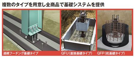 住金システム建築では、すべての商品で基礎工事を含めて対応することができる。熟練工でなくても施工可能なため、工期、コストの圧縮に貢献。建物の種類などに応じ、連続フーチング基礎、QFU、QFPなど多彩なタイプを用意している。