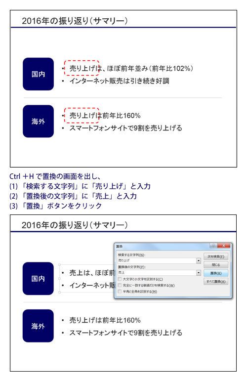 資料作成のルール 秘訣 #パワーポイント #プレゼンテーション 2016/06/02 10:00 #1 #2 #3 #4 #5 パワーポイントの「置換」で大失敗した上司 PRESIDENT Online 熊野 整 +フォロー 前ページ 1 2 3 次ページ (3)置換機能 前述のとおり、用語集を作成しても、それでも表記がブレてしまうことは多々あります。このようにブレてしまった表記を統一するには、「置換」という機能が有効です。 今回は、この置換機能の使い方について詳しくご紹介します。 たとえば、この表の「売り上げ」を「売上」に変更する場合、下記の手順で置換できます。 すると、「売り上げ」を「売上」に変更することができます。置換する場所が2カ所以上ある場合には、そのたびに「置換」ボタンをクリックすると、1つずつ置換することができます。 次ページ 1 2 3 『外資系投資銀行の資料作成ルール66』(プレジデント社) STEPをなぞるだけ、見やすく、シンプル! 伝わるプレゼン術、「外資のスキル」を簡単マスター! 著者 熊野 整 AMAZONで購入する PRESIDENT Storeで購入する 関連記事 5分で完成!一発OK!「資料」のカンタン作り方 外資系コンサル「入社1年目のエクセル研修」に潜入! 資料づくりの出発点は「達成すべきゴール」をズバリ「一言」で ランキング 1位 だから同年齢で「見た目」に天と地の差がでる…大学病院の医師が伝授「老化の進行を大幅に遅らせる手段」 ランキングをもっと見る キャリア #パワーポイント #プレゼンテーション #資料作成