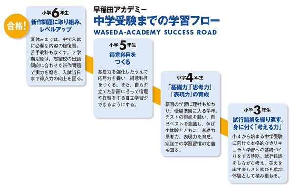 苦手科目の克服には、小5から取り組みはじめる。小6からは苦手教科、苦手単元のレベルアップを図り、実践的な受験準備に入る。早稲田アカデミーでは、志望校別の専門チームで、カリキュラムや教材、入試対策を徹底して研究し、学習指導に反映させている。