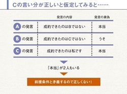 例題。A、B、Cという営業マン3人がいる。そのうち1人だけが商談で成約にこぎつけたのだが、各人は次のように発言した。