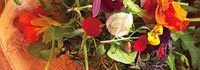 【2】ナスタチウム、ベゴニア、ルッコラ、水菜……大きな木の器で提供される色鮮やかな「花と野菜のサラダ」。野菜は25種。花はピンセットで繊細に盛りつけられる。