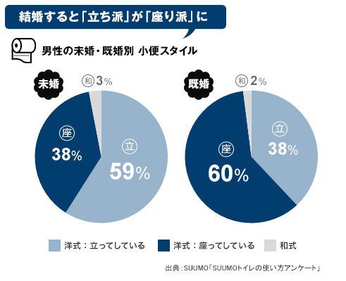 SUUMOの調査でも立ち派と座り派は43%:55%と拮抗。座り派が若干上回っている。さらに興味深いのは、未婚の場合6:4で立ち派が多いのに対し、結婚すると4:6に逆転し、座り派が多勢になっていることだ。