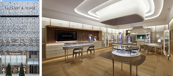 去る3月31日、フランスの高級宝飾・時計メゾン、ヴァン クリーフ&アーペルの銀座本店が移転リニューアルオープンを果たした。旗艦店と位置付ける同店が建つのは、東京・銀座の中央通りに面する一等地。メゾンの象徴的なモチーフであるロザンジュ(菱形)パターンを散りばめたファサードが美しく、銀座を行き交う人々の足を止める。店内は外光をふんだんに取り入れる設計で開放感があり、木材の質感を生かして曲線を多用したインテリアが高級感を醸しながらもどこか優しげな印象を与えている。エクスクルーシブなイメージが強い従来のメゾンのブティックとは一風変わった、現代的で居心地の良い空間だ。