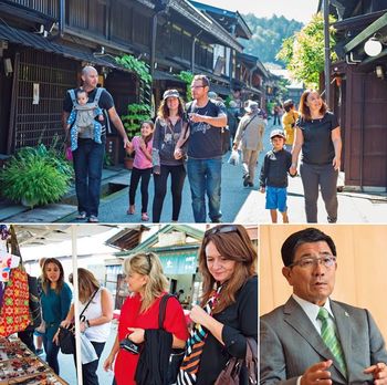 (上)城下町・高山市の古い町並み。(左下)の「宮川の朝市」とともに、散策する観光客で賑わっている。(右下)古田肇岐阜県知事。人口減少社会に向け、6年前に岐阜の観光、食、モノを海外に売り込む長期構想を打ち立てた。